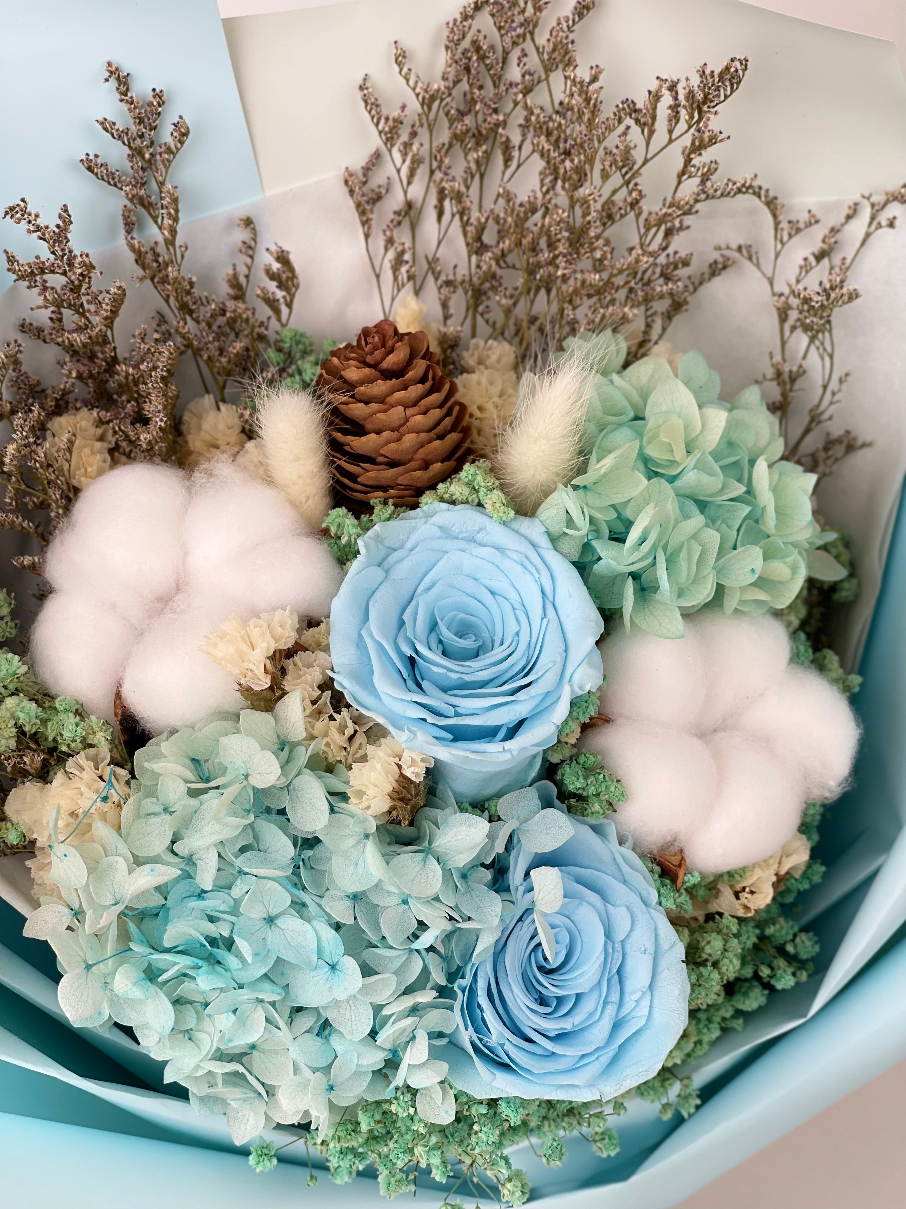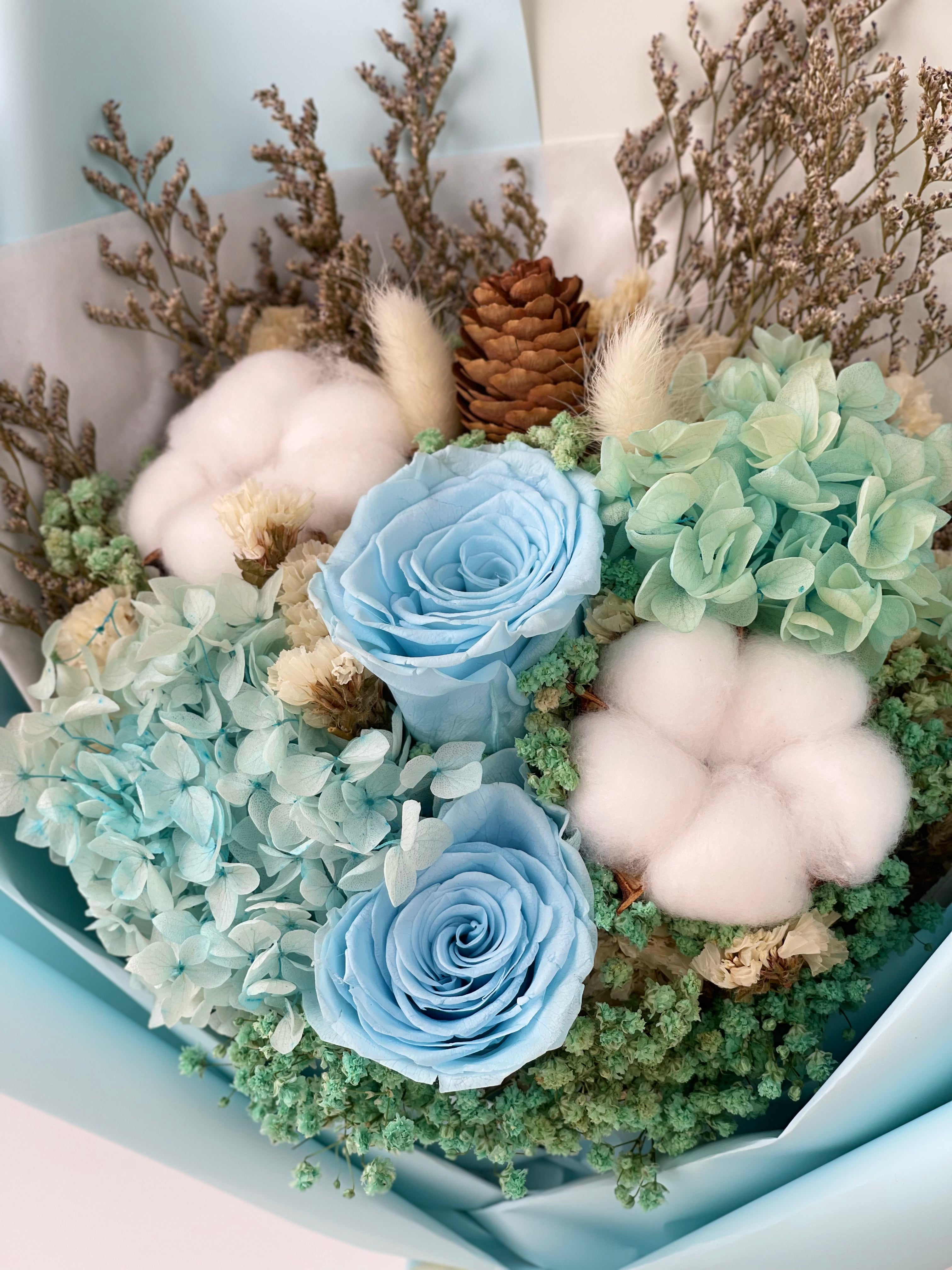 Bluro! is a preserved flower bouquet with a beautiful arrangement of roses, hydrangeas and cotton flower resembling the Mother Of Pearl. This arrangement also represents innocence, purity and femininity.