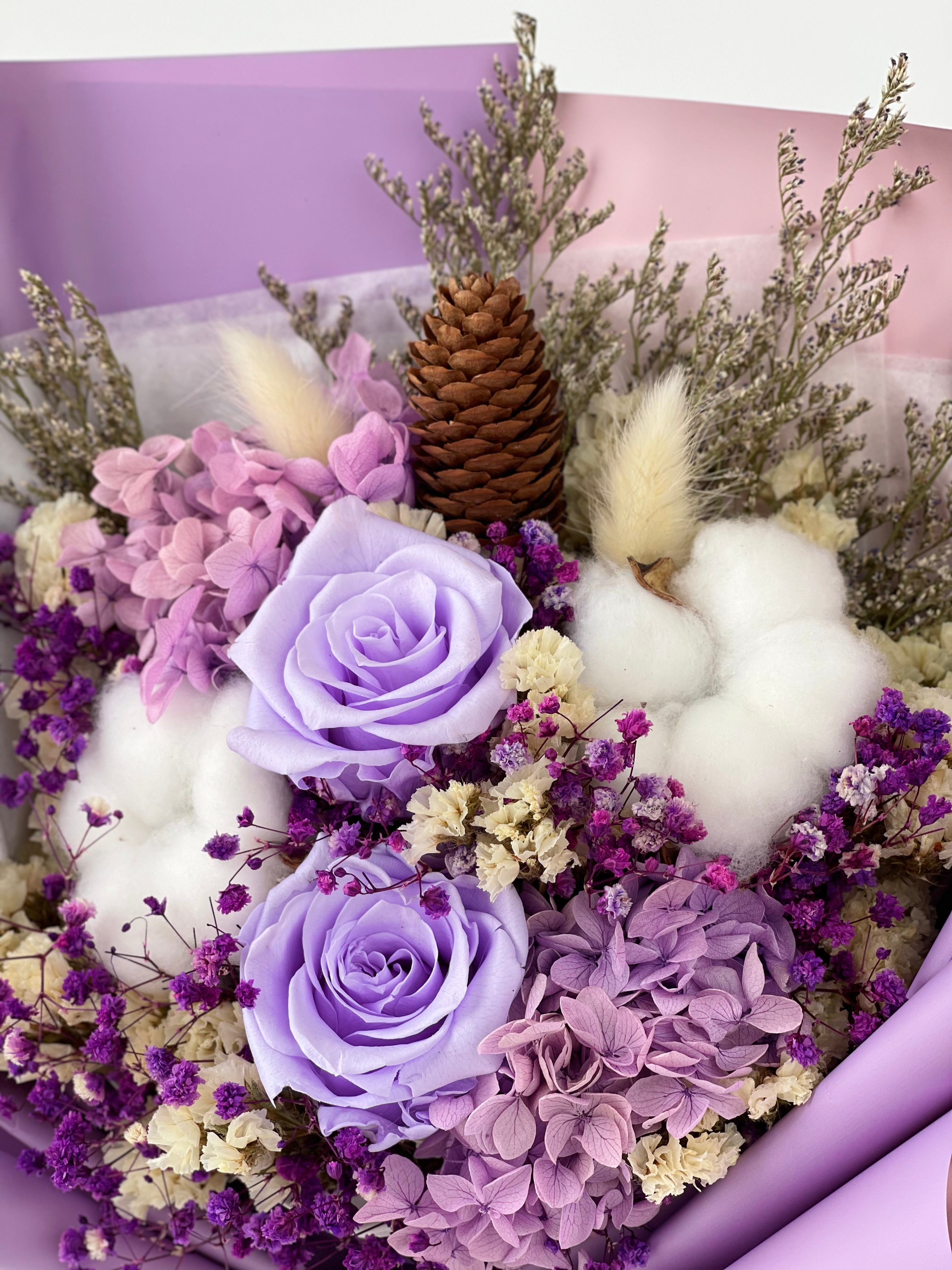 Purpo! is a preserved flower bouquet with a beautiful arrangement of roses, hydrangeas and cotton flower resembling the Mother Of Pearl. This arrangement also represents innocence, purity and femininity.