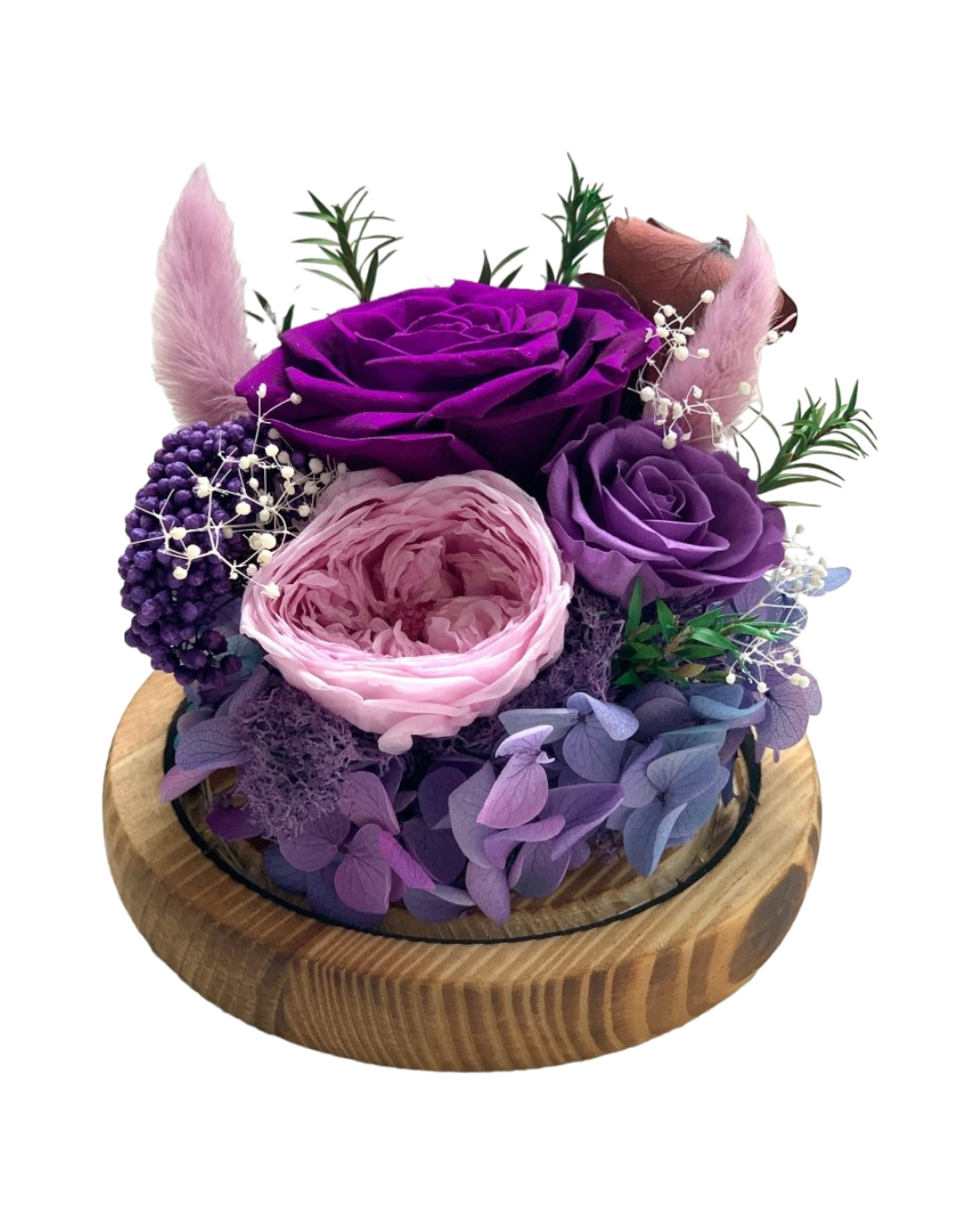 • Handcrafted preserved floral arrangement in a glass ball dome